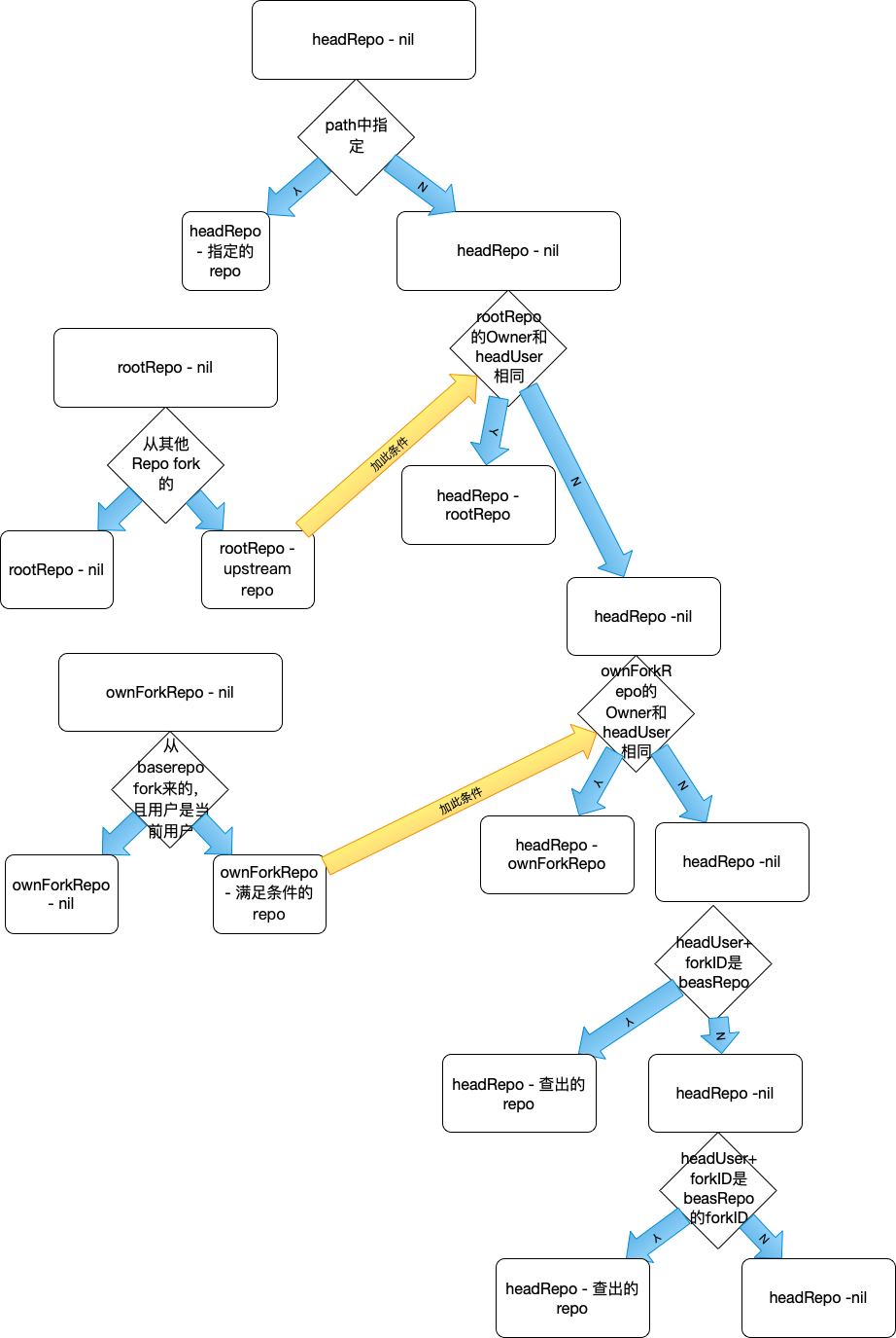 你提交的baseRepo可能是其他repo的fork,将这个repo命名为rootRepo 如果提交者不是baseRepo的owner,baseRepo的forks中有一个是current user,将这个库命名为OwnForkRepo 从前面的代码我们已经知道,如果没在路径中指定,这个headRepo和baseRepo相同。如果只指定了headUser,且这个user和base的owner相同,headRepo和baseRepo相同。如果指定了headRepo,那就是headRepo。所以除此之外,headRepo是为空的。如果headRepo为空的时候,且rootRepo不为空,且headUser = rootRepo的owner,将headRepo设置为rootRepo。 当前一个不满足的时候(headRepo还是为空,是因为rootRepo的一些属性不满足),再看ownForkRepo,如果ownForkRepo不为空,且headUser = ownForkRepo的owner,将headRepo设置为ownForkRepo 如果还是不满足,在repo列表中查找owner是headuser的,且从baseRepo fork出来的repo,将它设为headRepo。 如果还不满足,在repo列表中查找owner是headuser的,且这个repo和baseRepo从同一个repo fork出来的。即这个repo和baseRepo是同一个 父节点。将它设置为headRepo 如果还未满足,放弃。 总结一个图
